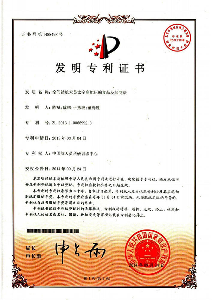 公司独家具有中国航天员科研锻炼核心的空间坐航天员食物专利手艺——《空间坐航天员高能压缩食物及其制法》,专利号为ZL2。3。这一空间坐航天员食物专利手艺,是公司正在食物范畴的焦点合作力所正在。它享有独家法令樊篱,为公司建立了绝对的合作劣势,使得公司正在市场中独树一帜。